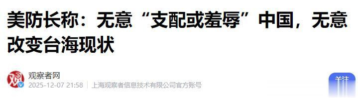观察者网:美防长称:无意“支配或羞辱”中国,无意改变台海现状