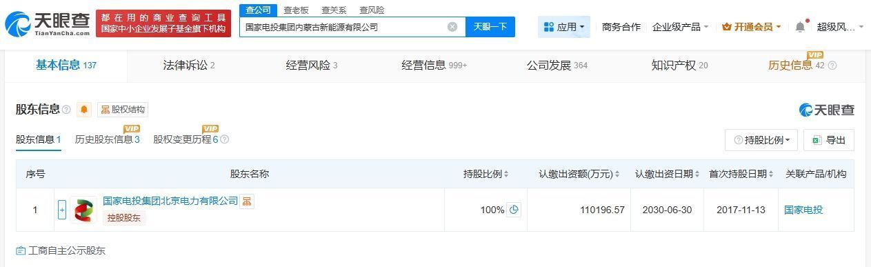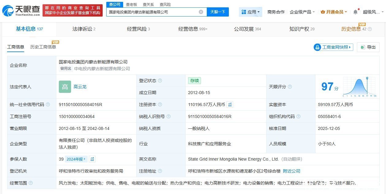该公司成立于2012年8月,法定代表人为高云龙,经营范围包括风力发电、太阳能发电、电力高新技术研发、电力设备的销售等。股东信息显示,该公司由国家电投集团北京电力有限公司全资持股。
