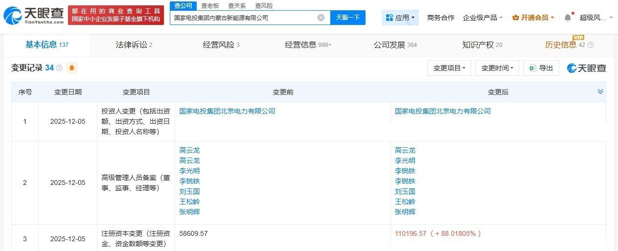 天眼查App显示,近日策略盈,国家电投集团内蒙古新能源有限公司发生工商变更,注册资本由约5.9亿人民币增至约11亿人民币,增幅约88%。