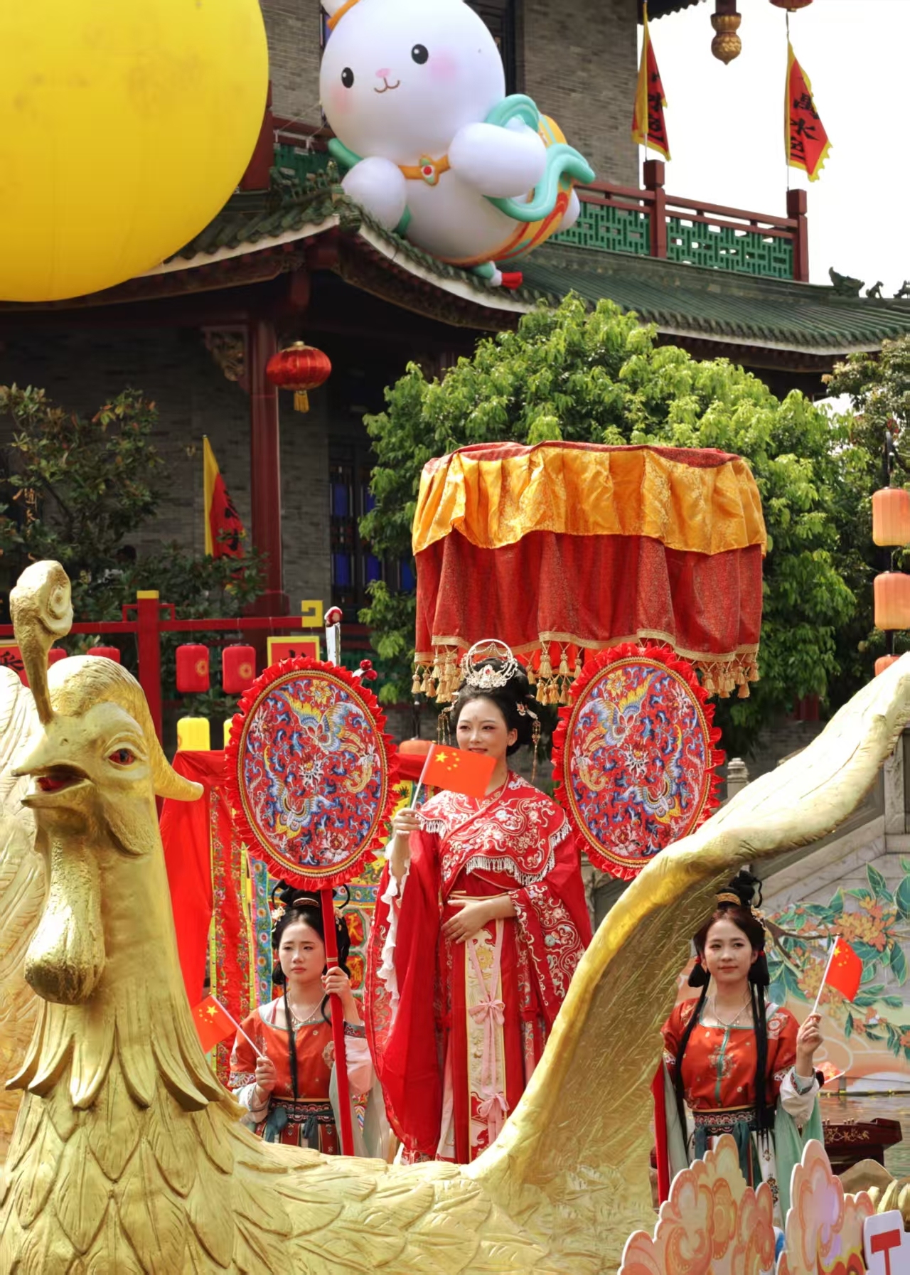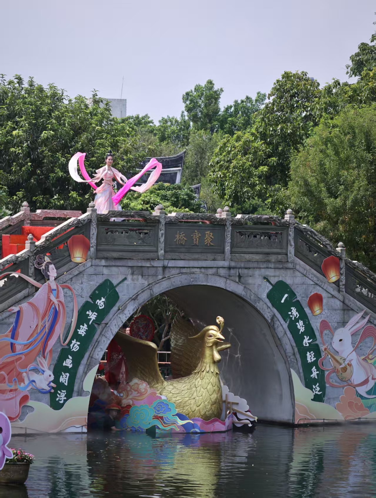 岸上风情:聚宝桥上,嫦娥仙子翩翩起舞,长绸翻飞,与古建檐角的大型玉兔揽月灯组交相辉映,营造出“彩云追月”的唯美意境,传递中秋佳节团圆喜庆的美好寓意,与广大游客共庆佳节。