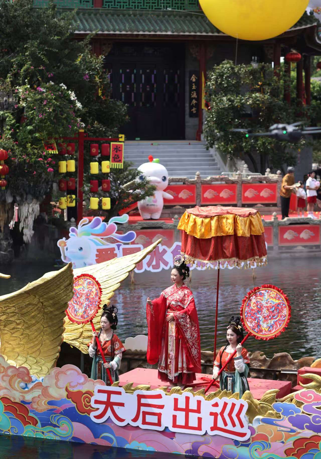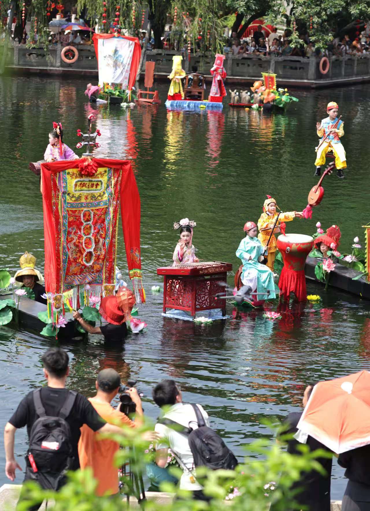 水上奇观:天后乘凤艇开道引领四板番禺水色隆重登场,宝墨园匠心独运,遴选了色仔数量多、观赏性强、难度系数大的水色“天籁之音”和独具特色的“包公出巡”“哪吒伏魔”“青萝三凤”等水色表演与游客见面,小演员们凌波而立,尽显番禺水色绝技。