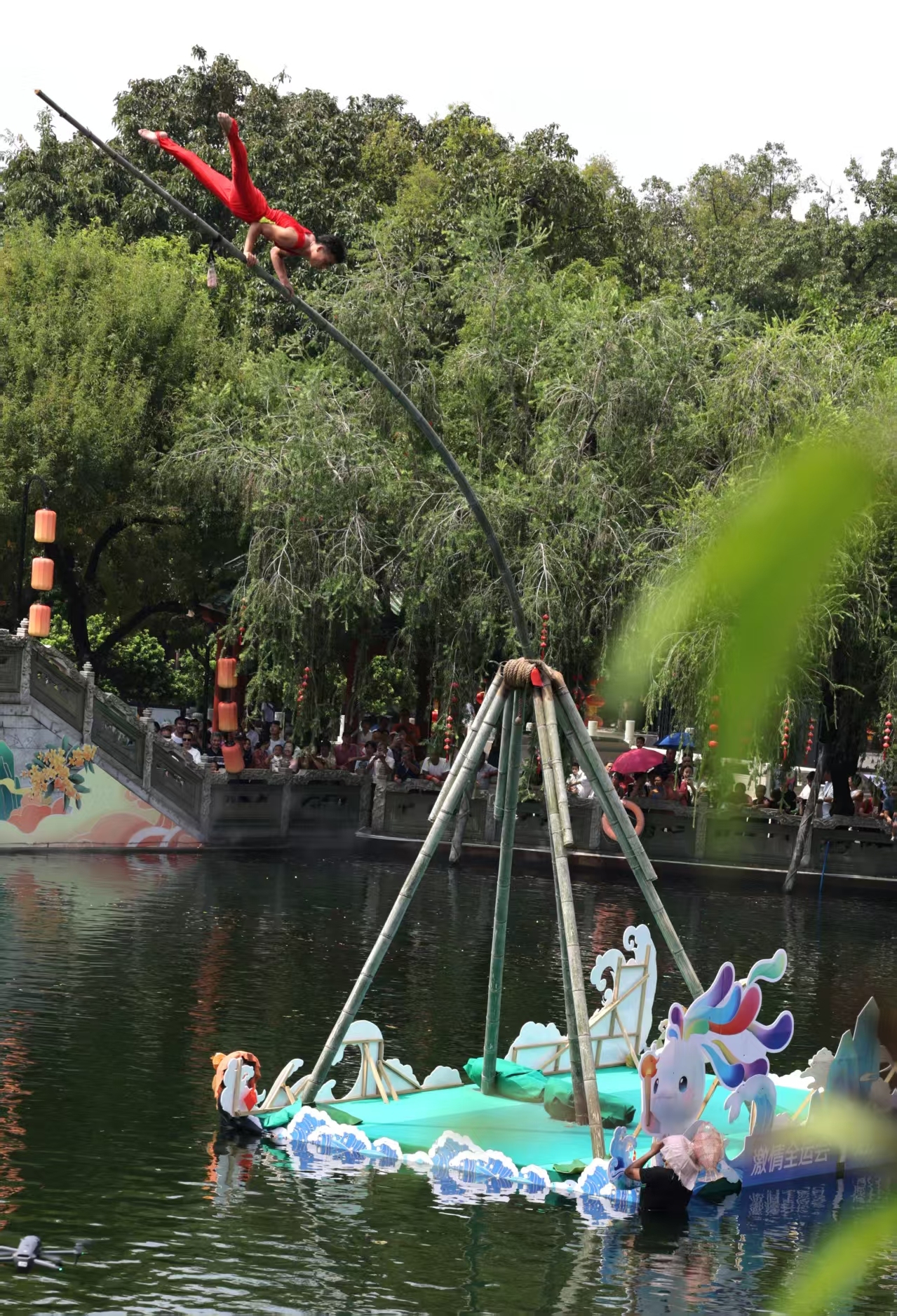 特别打造的全运会主题花船巡游湖面,非遗艺人更在高达13米的高竿之上赤手空拳献技,完成高空倒立、旋转等一系列高难度惊险动作,以“一船一人一竿”的极致形式展现中国功夫美学,巧妙融合非遗魅力与现代体育精神。